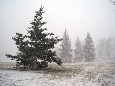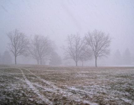 Half way around the park, the snow and wind are blowing hard enough I have to look down at my feet, can’t easily see or breathe if I look straight ahead. The snow muffles everything, turning the park cold, white, and quiet.