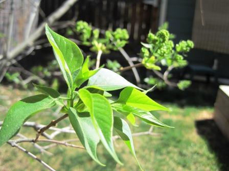 My lilacs went from tiny leaf buds just last week to full leaves, with blooms that look like fruit, some kind of grape or berry. The white one on the far right is going to once again be covered in blooms.