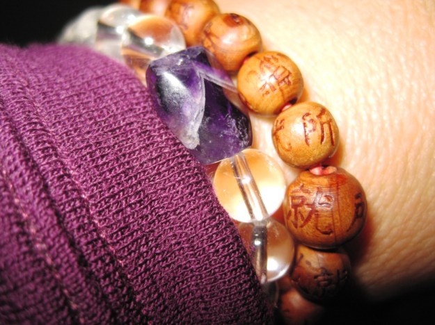 The crystal and amethyst mala is newer. I just bough it at the Shambhala Mountain Book and Gift Shop when I was there for the Fearless Creativity Writing and Meditation Retreat with Susan Piver. I’d been wanting another one, have been loving how Susannah Conway layers her bracelets, and have often admired the crystal one Susan Piver wears sometimes. In my practice tradition, and in other forms of Buddhist practice, crystal is a symbol of awakened mind, of enlightenment. When I was picking which one I wanted, I was drawn to this one because of the amethyst. My favorite color is deep purple, but I also found out later that the amethyst crystal is meant to help with addiction, to instill a sober mind, to ease insomnia, to guard against guilty and fearful feelings, worn as a protection against self-deception, symbolizes spiritual wisdom and openness, can be used to attract love and happiness, to aid in meditation, is often worn by healers, and has a calming, cleansing, and protective energy. These are all good things.