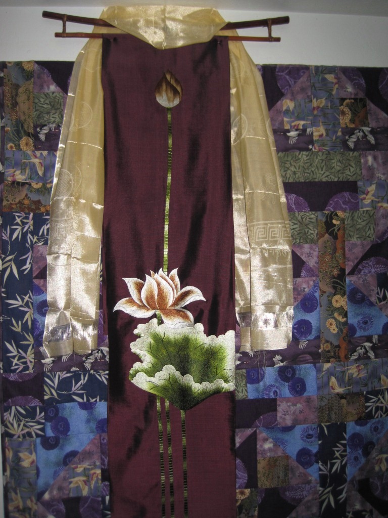The quilt behind it is what served as my Thangka before I had the other. It was made by my aunt, my godmother, who is a fabric artist and quilter. Some day I will write a post, give you a tour through the amazing collection of her work that covers the walls of my house, and both Eric and I’s offices. Her work is truly amazing, and she has gifted me with a lot of it over the years, because she knows how much I love and appreciate it. I have also bought my own pieces from her shows, and my mom has also given me many over the years.