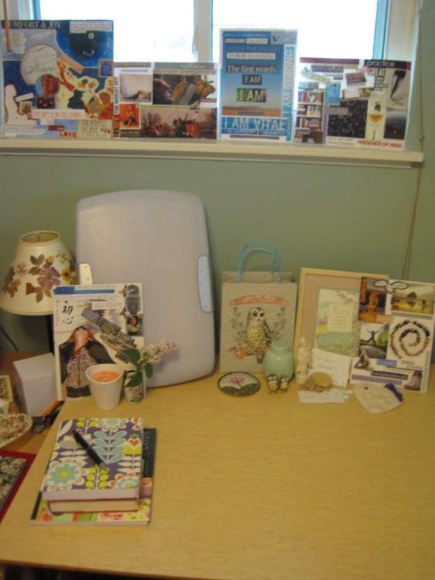 And finally, the Khata that is draped over my Thangka, is a special object, so precious to me. A Khata is a traditional Tibetan scarf, used as an offering of gratitude and good luck, a show of appreciation and love on the part of the giver. It’s often used as a way of decorating an object of practice or great value (such as draping it over the picture of a spiritual teacher), or offered by a student when they receive a teaching or practice, or given to someone who is about to depart on a journey. At the retreat with Susan Piver, on our last day, I gave her this scarf along with letters of love and gratitude, along with my adoration and appreciation. As might happen, the teacher can offer it back to the student, and Susan did just that. This act was so precious to me, I am crying about it again as I tell you. I can’t think about that moment without my heart going soft and tears starting. I know that ultimately I have saved myself, but there are some people whose support was critical, whose wisdom and kindness made all the difference, who I will never be able to properly thank, and Susan Piver is one of those people.