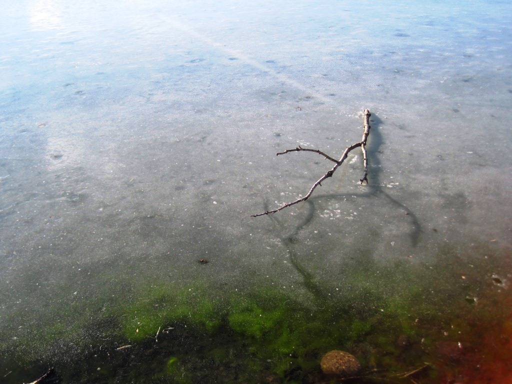 On our walk yesterday morning, the frozen ponds were melting, singing and moaning, and I noticed around the edges that algae was starting to form, bright spring green spreading under the cloudy frozen surface of winter. The sky was bright blue, the sun blazing, and later in the afternoon, it turned gray and thick, and there was snow.