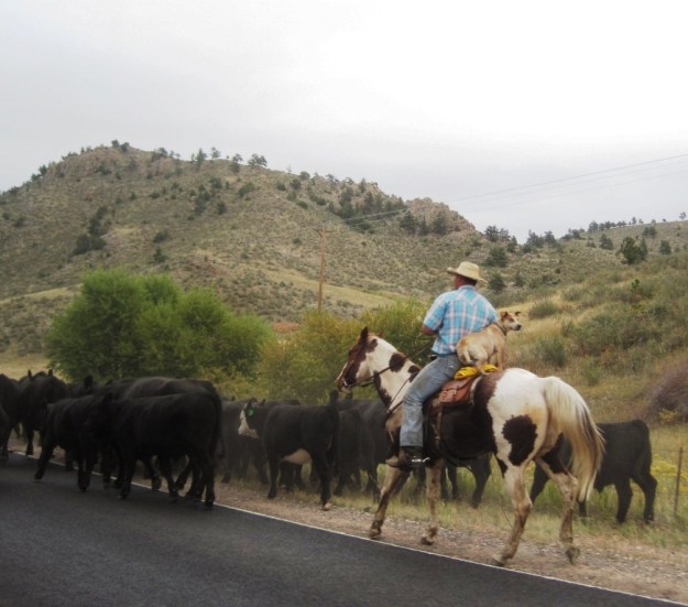 On the way back to town, we met up with a cattle drive. I told Eric, “you know you live in Colorado when you see a moose and a cattle drive on the same morning.” The Cattle Dog mix riding on the back of the horse with his person was just about one of the cutest things I’ve ever seen. Do you see how he’s smiling?