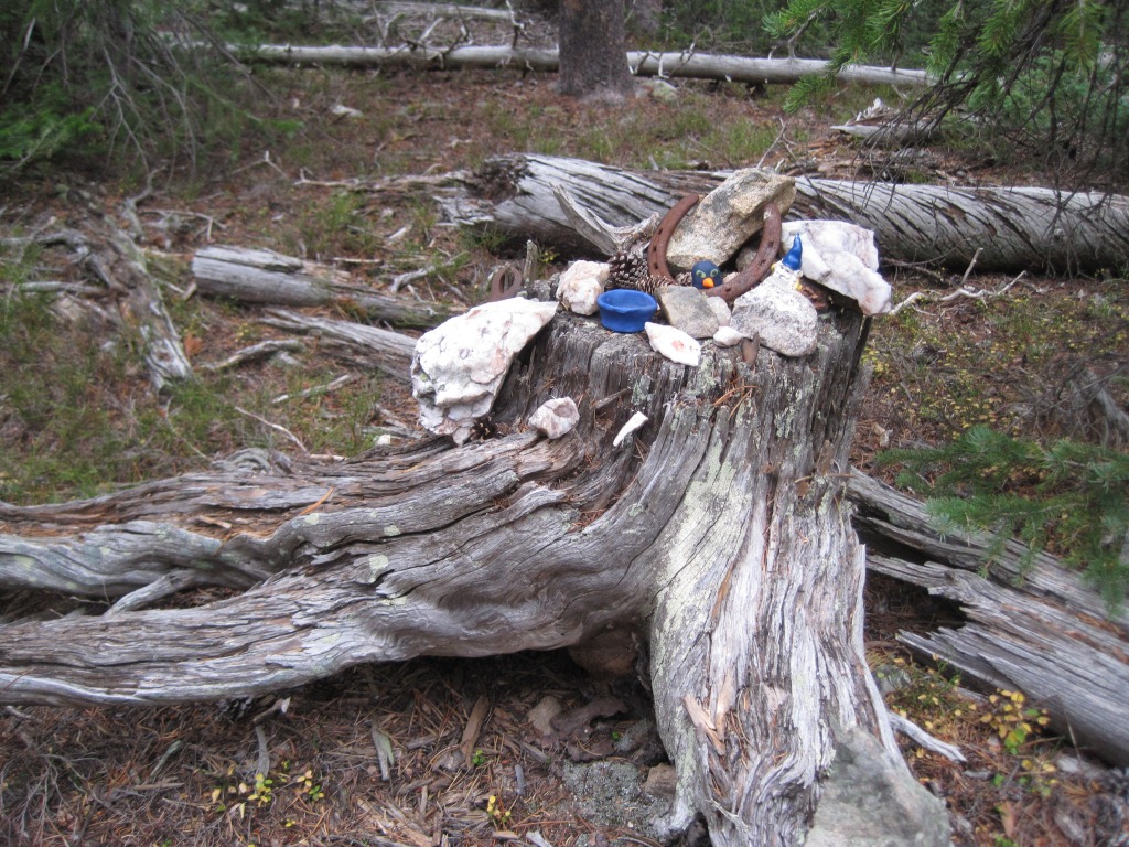 Someone had also built a shrine on a tree stump. Somehow we hiked right past it on the way in, but noticed it on the way out. Eric asked if I had anything to leave, but all I had was a spare battery for my camera, dog treats and poop bags.
