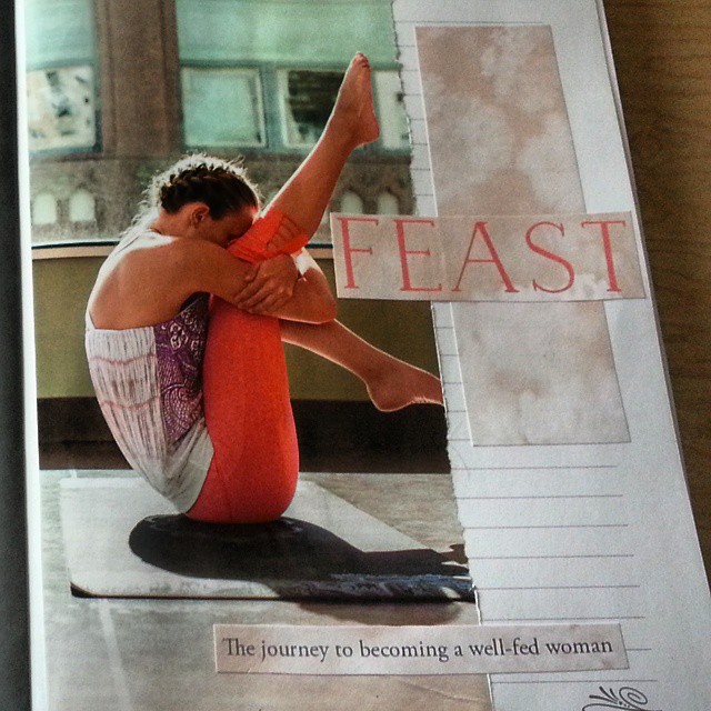 I start Feast with Rachel Cole on Monday. I spent some time putting together a journal I’m going to use to respond to prompts and make notes. I cut out pictures and quotes, gluing them into the first few pages. It wasn’t because we had to or that I felt like I should, it’s just what I do to every space I inhabit where I am going to practice. It’s a way of setting an intention, honoring the process. It’s also a weakness, born of fear — I want to feel like I have some control over what’s about to happen, to make sure I’ll be comfortable and safe even as I know that’s impossible.