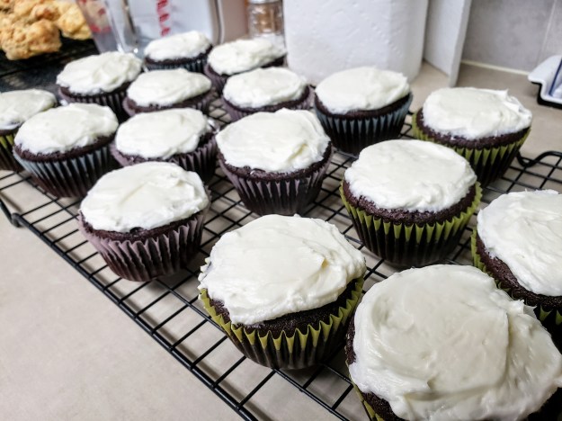 2. Cupcakes. These are the ones I really wanted when I made some last week. The first batch turned out terrible. These aren’t a recipe adjusted for the altitude here, and the batter is deep and dense. I’ve baked these before, but the first time yesterday, I filled the cups too full and they spilled over then collapsed. We saved them because even though they were a mess they still taste good, but I made another batch to take with us to share. I made a few adjustments to the recipe for altitude (less baking powder, less sugar, and a bit of additional liquid) and filled the cups only half full, and they turned out pretty good. I also realized the mistake I’d made the last time with the frosting — I used butter and powdered sugar but forgot the cream cheese. It makes all the difference.