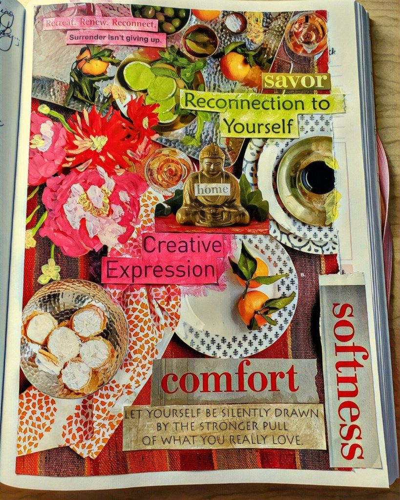 4. Retreat. Calyx and I are starting a retreat together later today. We came up with a schedule, time to practice together and on our own, made a commitment to give ourselves the time and each other the support. We’ll go through Wednesday and I am really looking forward to it. When I was making art with my friend Janice this week, I made this collage in honor of the plan.