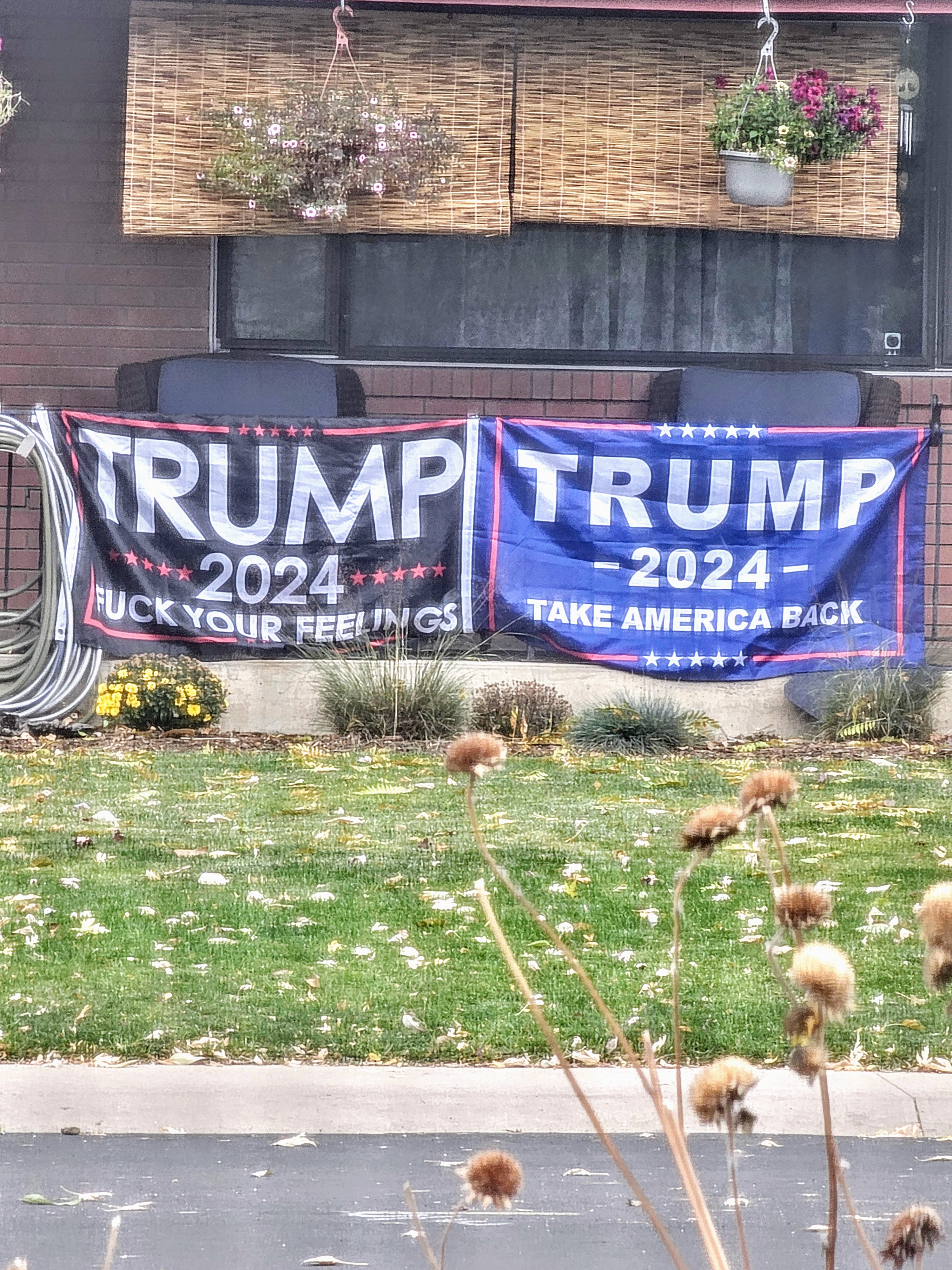 Those flags… Don’t you feel like, on some level, the need for people to purchase and display there HUGE flags like that is some weird kind of over-compensation for.. something. I mean, he’s just some guy. It’s like crazy hero-worship. Cult-like. Creepy. Blatant and in your face, and to what end? To feel like they’re part of the winning team? Especially the F your feelings flag. I mean, you have to be really gross to be a grown-ass adult flaunting such nastiness due all the world to see. I’m so sorry you have to see that every day. 😔