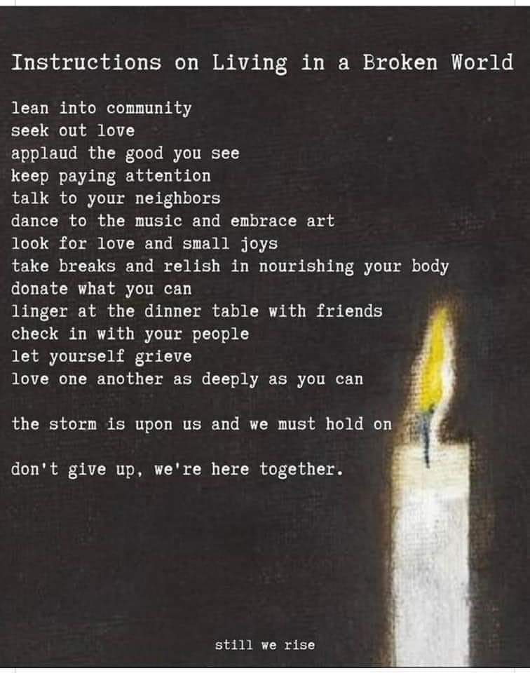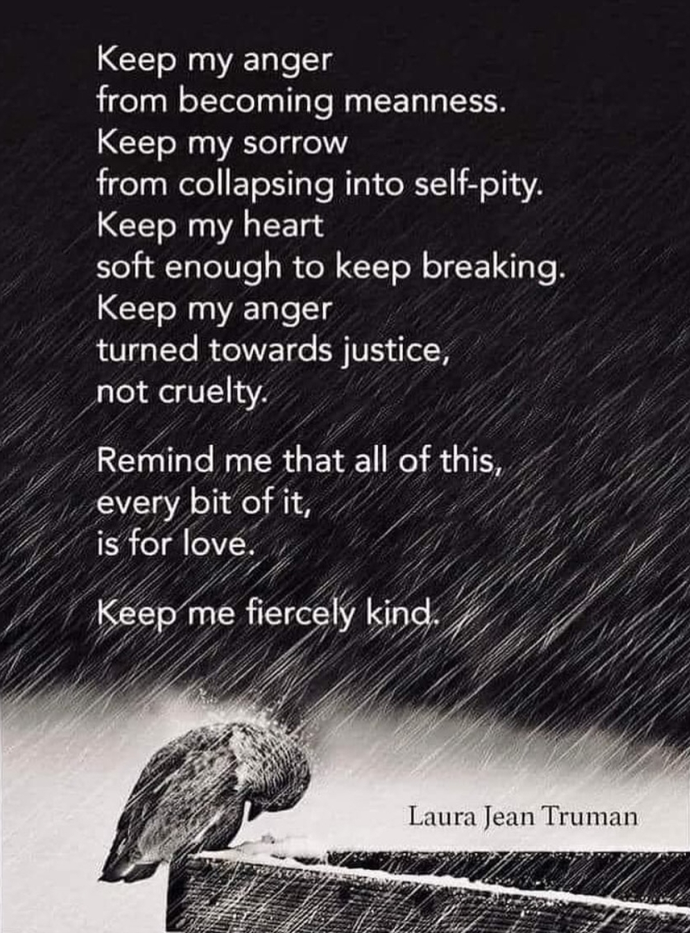 One (or more) wish(es): May we stay tender and strong. May we maintain our sense of humor and allow for joy. May we keep our hearts open. May we act from love. May we protect those in need of help from whatever harm comes their way. May we continue to love our neighbors, no matter how hard they make it. May we maintain our sanity in the face of madness, and offer our wisdom and compassion to a world that needs more of both. May we ease suffering — in ourselves and in the world. May we never ever give up.
