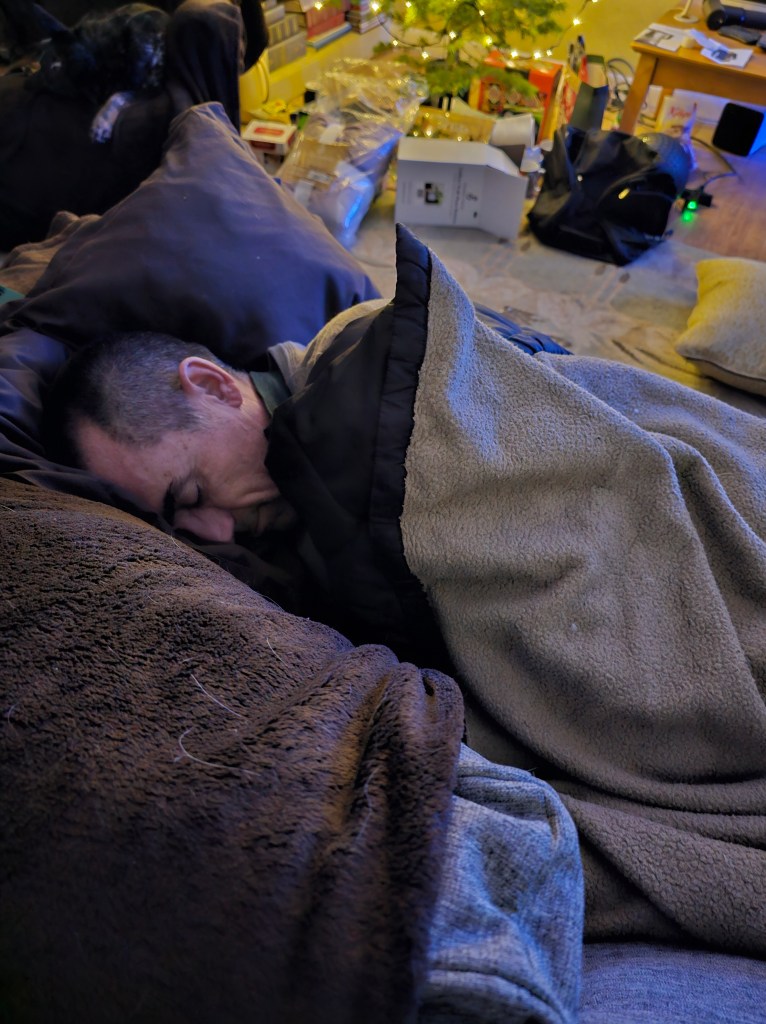 At our house, Ringo was too tired from his morning walk to get involved in opening presents, and once the sun went down, so did Eric — literally fell asleep on the floor, lying on the Shakti mat he bought me. The funniest present Eric got me requires some back story: if I buy snacks, in particular candy, I have to hide it from Eric otherwise it will be gone. “Sharing” doesn’t really work, because I like to savor things, have just a little at a time and make it last, when if it exists he has to consume it all immediately. Over the years, I’ve had to find multiple hiding places because he eventually finds the current stash, so it slows him down but doesn’t stop him. Because of this, this Christmas he bought me a metal lockbox where I can hide my candy and he can’t get to it. I laughed so hard when I opened it. I’m not entirely convinced he didn’t have a copy of the key made before he gave it to me, however. 🙂