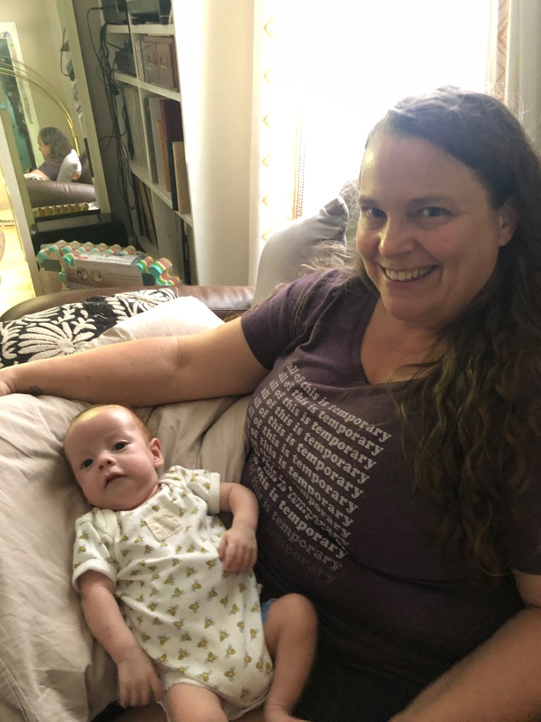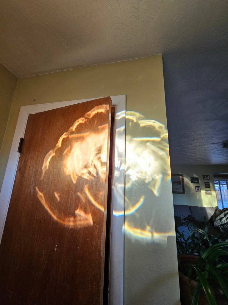 Bonus joy: Olly stress gummies, strawberries and raspberries, cinnamon swirl bread from The Bread Chic, good TV, listening to podcasts, comedy and comedians, getting the laundry done, poetry and poets, lowering the bar, eating whatever sounds good regardless of its nutritional value because sometimes you just need to eat something, crying, a hot cup of coffee and warm mug of tea, massage, getting in the pool and the sauna (they are going to be closed for about two weeks for repairs, *sob*), libraries and librarians, a warm shower, clean sheets, down blankets and pillows, staying in bed in the morning even though you are awake because it’s just so cozy, giving away things that are precious to people who are the same, hugs, birds, other people’s pets, Eric coming back to tell me Ringo had moved to that spot on Sam’s couch where the sun hits this time of the morning and the deep sigh he did when he laid down, this poem Michelle shared yesterday and in particular this line: “a wild place, toothed and flowering,” reading in bed at night while Eric and Ringo sleep, and these two pictures, one of my aunt Monica at her husband Bruce’s celebration of life service holding baby Hallie for the first time and another of the way the light hits the glass in my front door some mornings and reflects onto the wall.