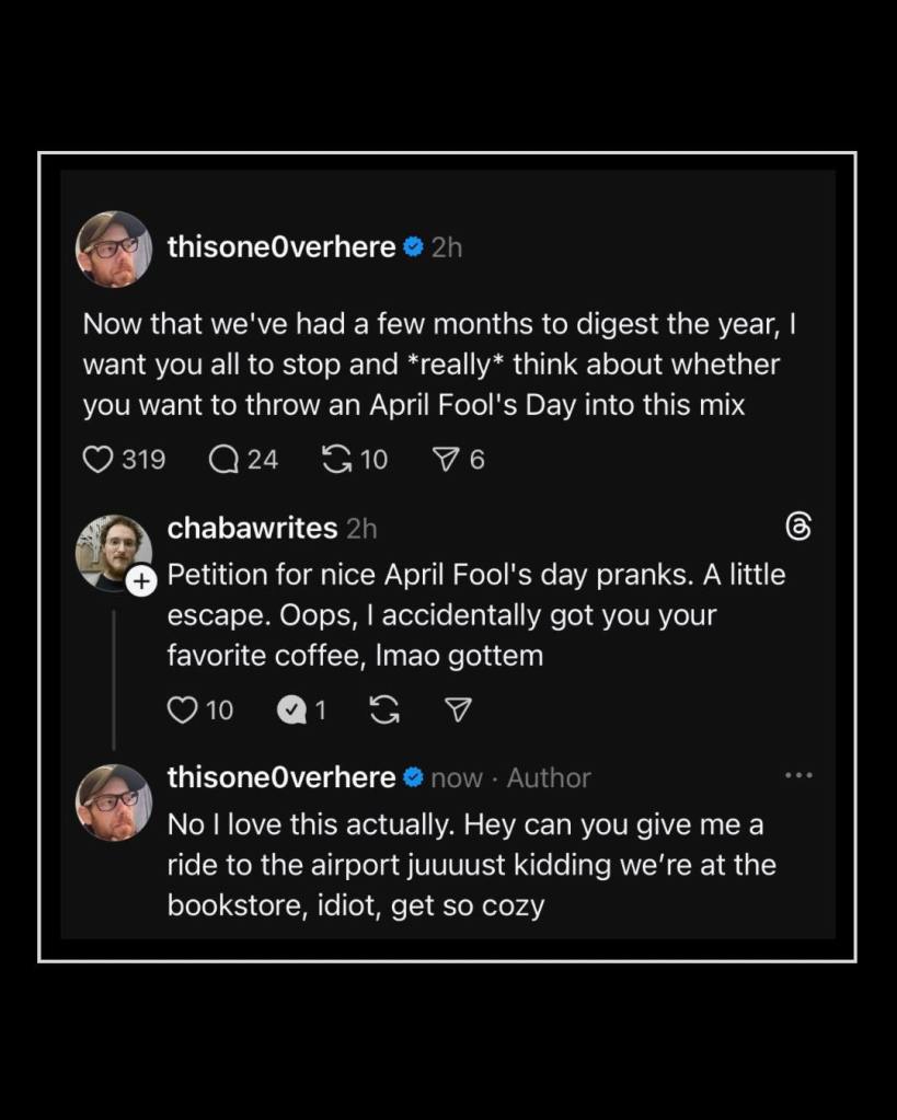 17. On Aging, Dying, Butter Melting, Crafting Legacy and Punching Robots from Chuck Wendig on Terrible Minds. “AI is soulless — so don’t let it sub in as your soul. And when you write, or make art, or do anything, put yourself into it. As wholly as you can. Without reservation. Be unabashedly yourself. Because that’s what goes out into the world. That’s the song you sing. Those are the echoes in this great cave. You’ll live on in others if you allow yourself to. We’re all just melting butter. Glorious, tasty, melty butter.”
