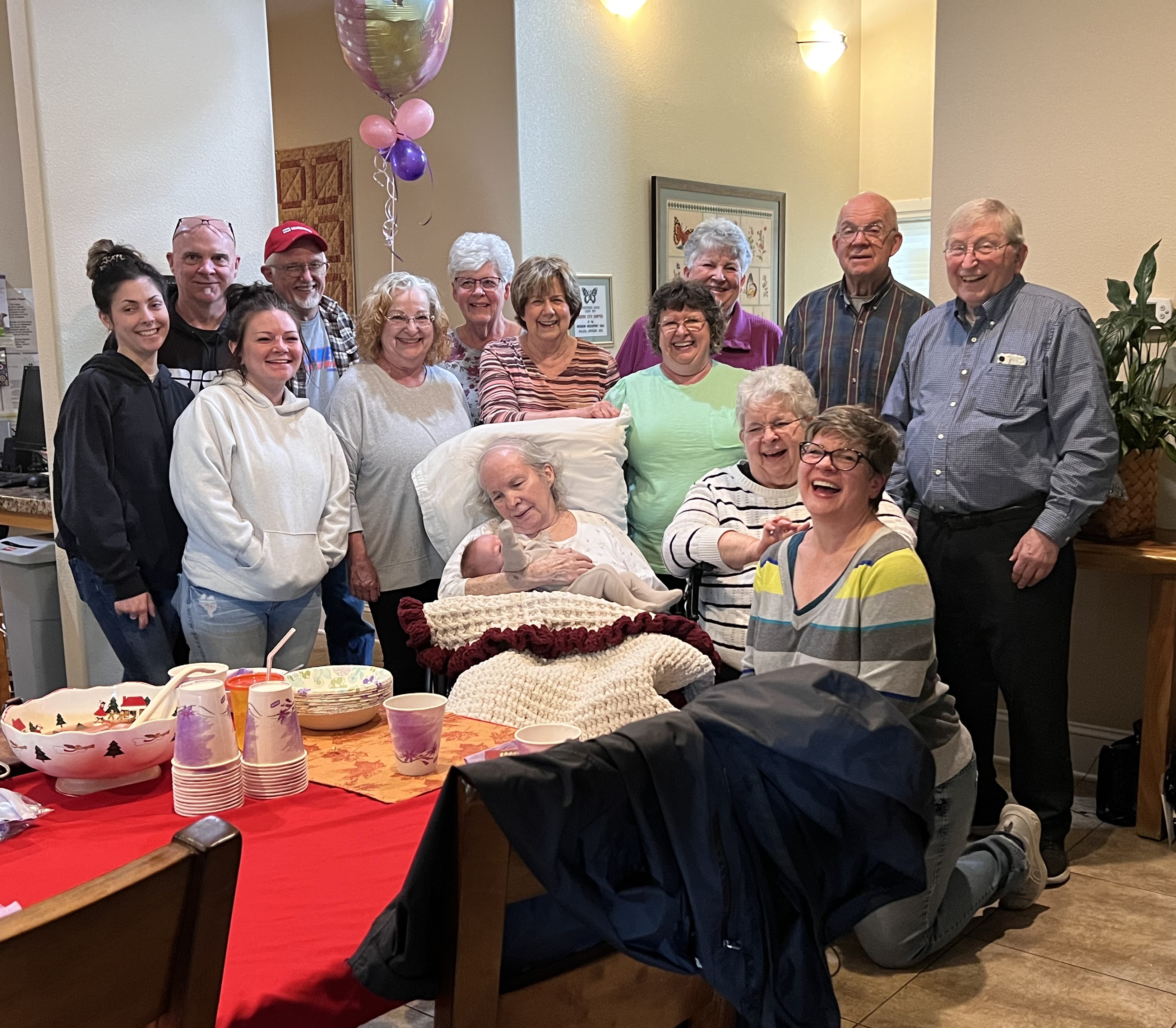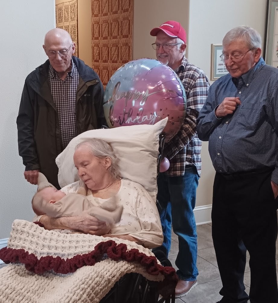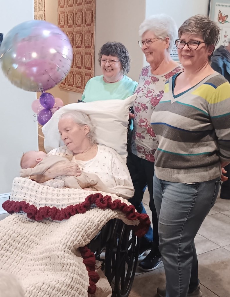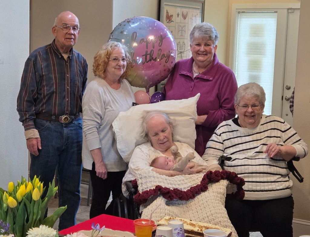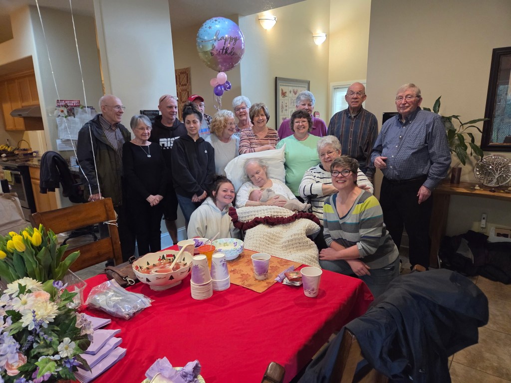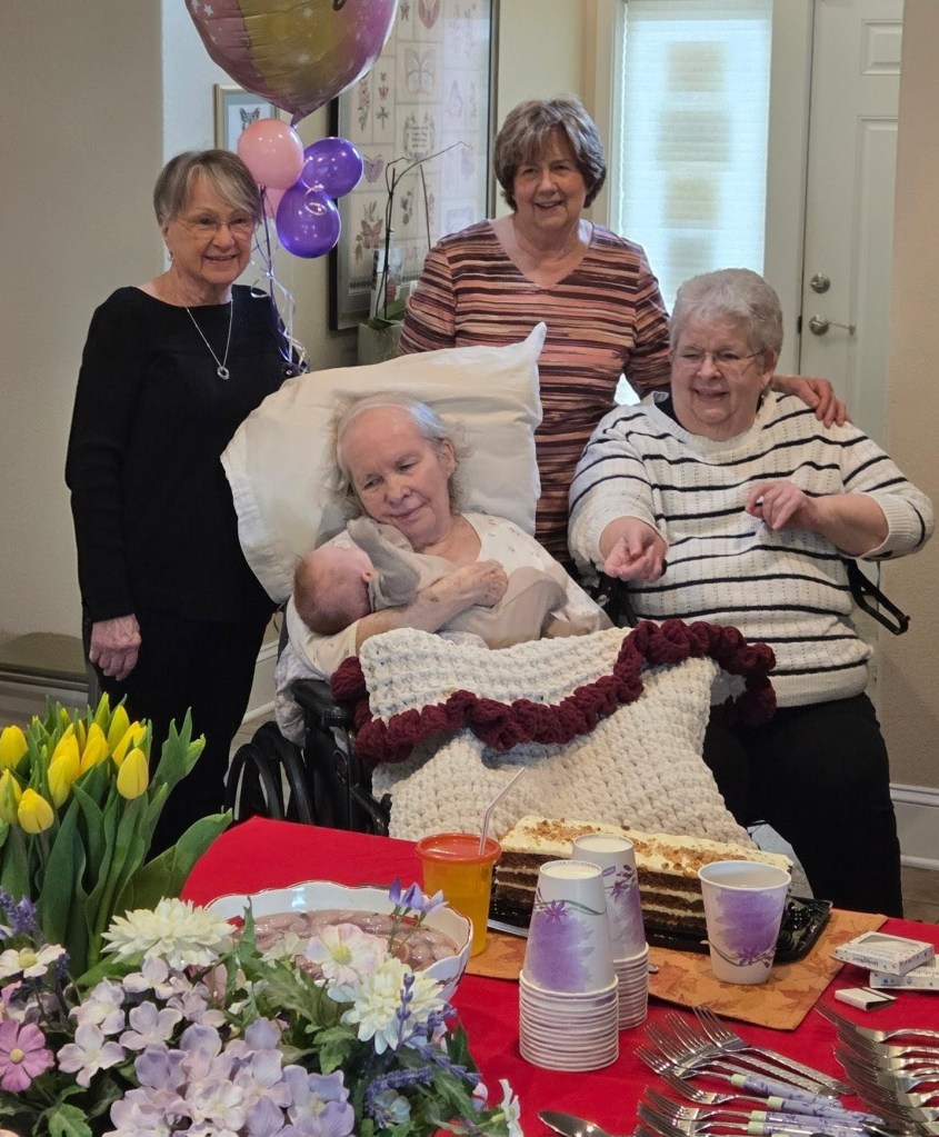 2. Mom’s birthday party was a success. She really seemed to enjoy herself, the gifts and the treats (the berry pie my aunt brought was her favorite) and the company, and as soon as they put her back in her bed, she passed out for a long nap. As always, and as is clear from the pictures, baby Hallie is still her favorite human, (seriously, as soon as you had her that baby, everyone else disappears — I like to pretend she thinks it’s me).