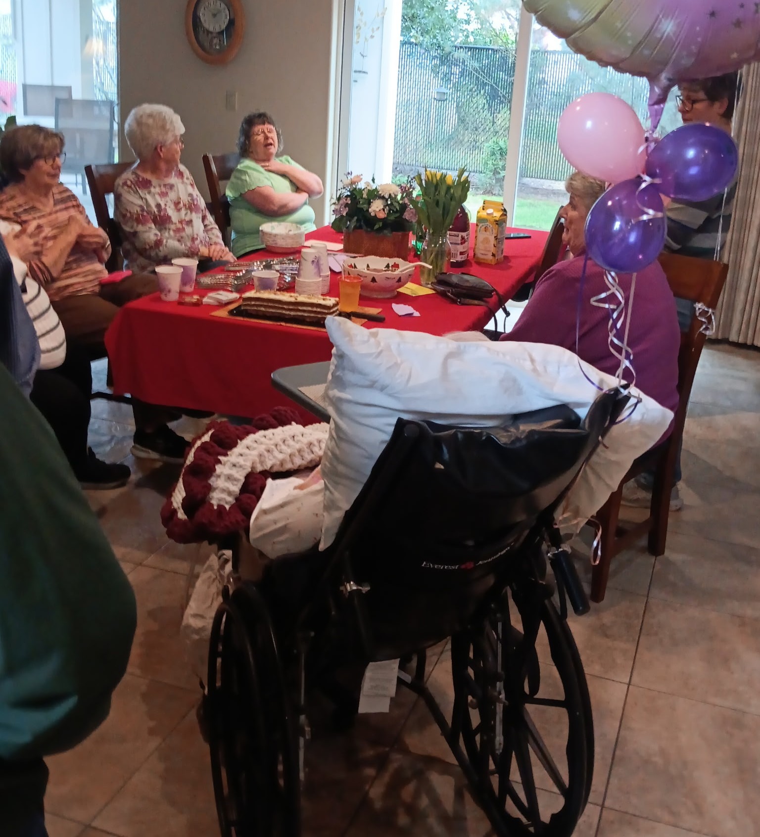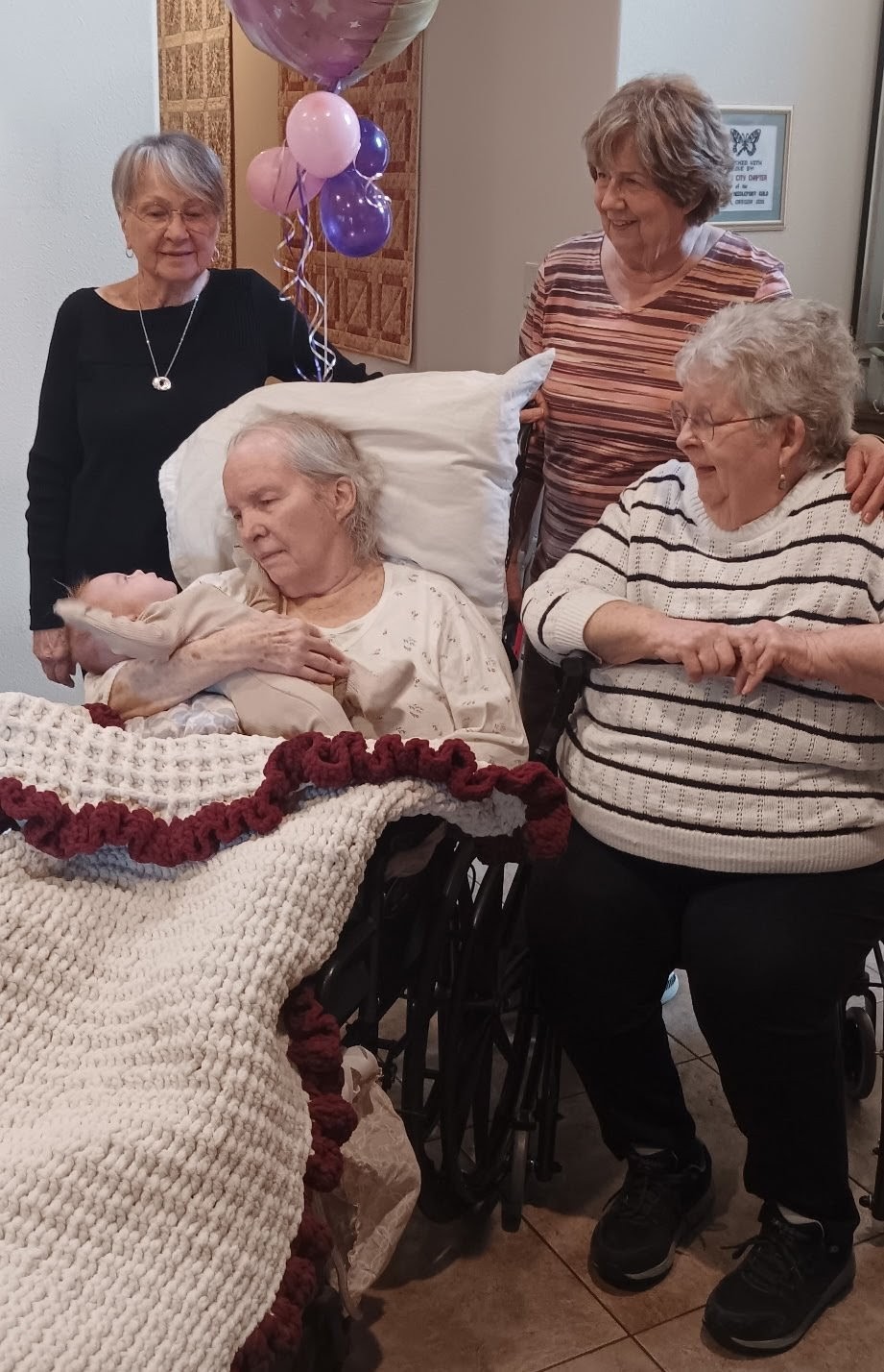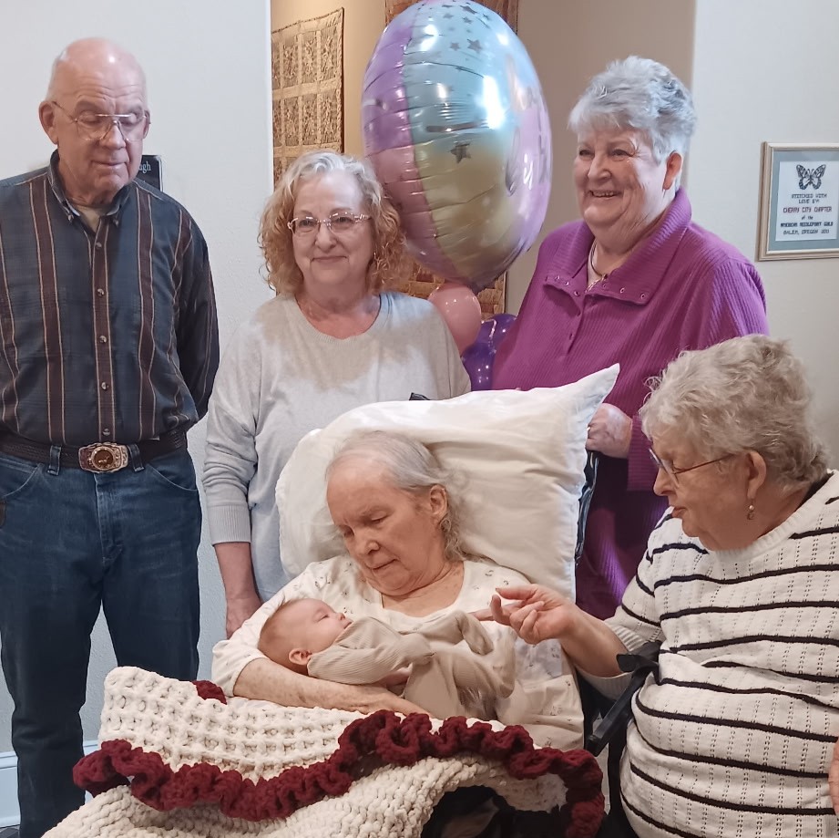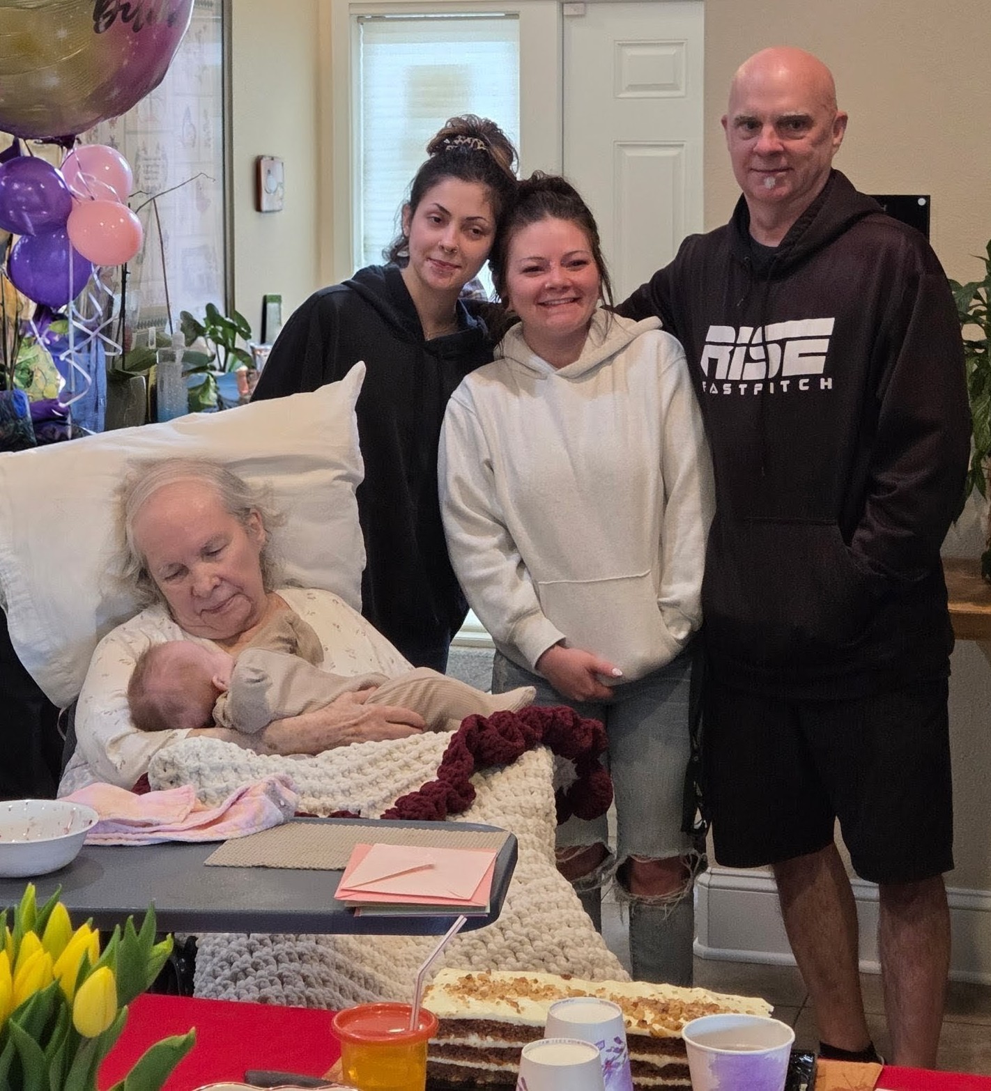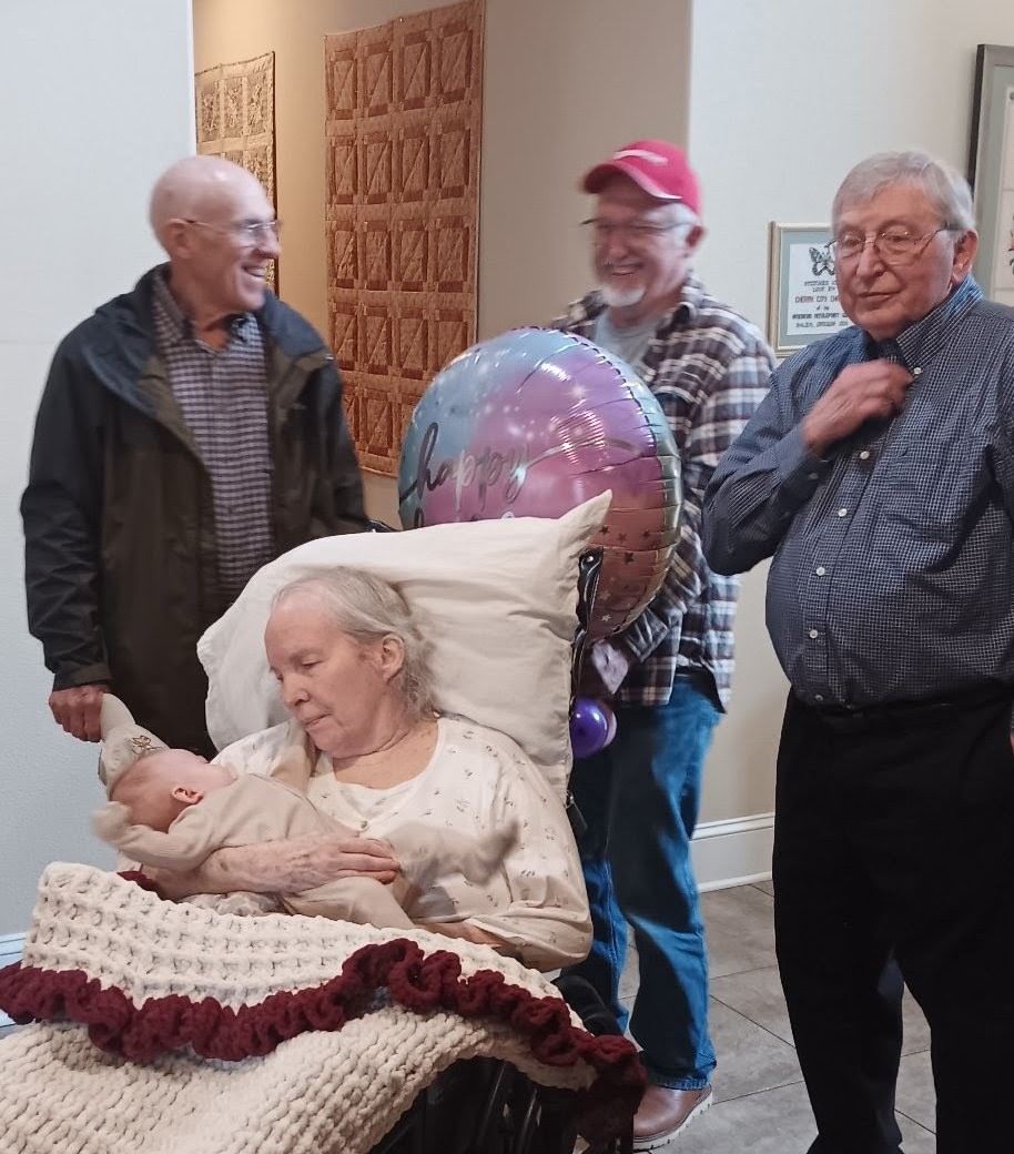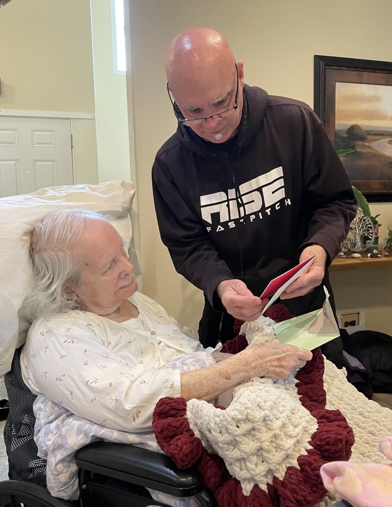 2. Mom’s birthday party was a success. She really seemed to enjoy herself, the gifts and the treats (the berry pie my aunt brought was her favorite) and the company, and as soon as they put her back in her bed, she passed out for a long nap. As always, and as is clear from the pictures, baby Hallie is still her favorite human, (seriously, as soon as you had her that baby, everyone else disappears — I like to pretend she thinks it’s me).