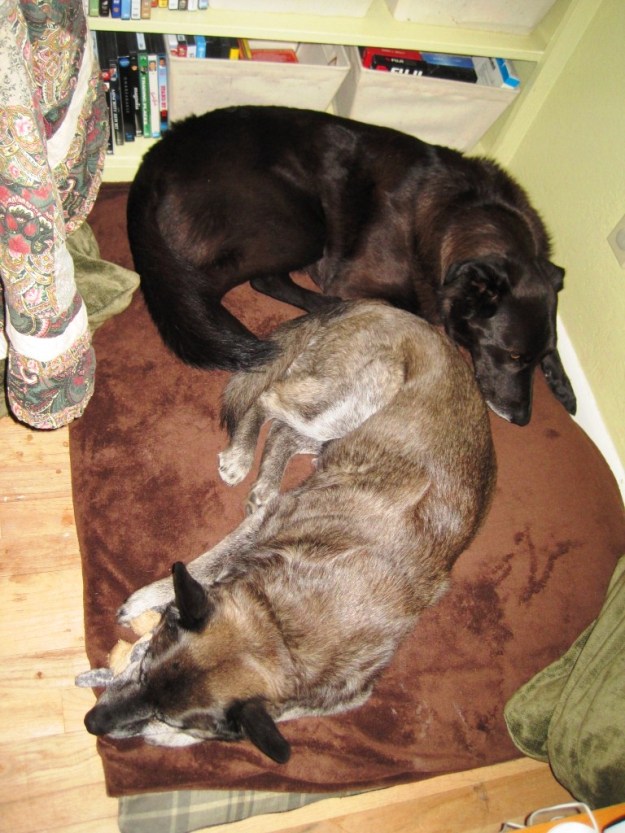 Dexter loved Obi as desperately as Obi loved me—the first time Dexter saw Obi, a big dog who was panting, whining, and shivering in fear, Dexter ran right over to him, stood on his back legs, put his paws on Obi’s shoulder and started to kiss his face. As a guarding/herding mix, Dexter’s loyalty included his whole pack, so it worked out for all of us.