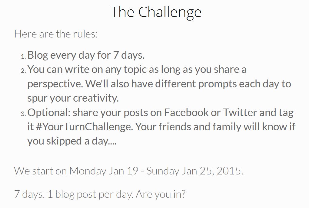 #40 on my Something Good list today was the Your Turn Challenge. I wasn’t planning on doing it, but then my friend and fellow blogger Kirsten Akens said she was going to do it, and I changed my mind. Maybe it’s a case of FOMO (fear of missing out), but I love a good blog challenge. In fact, this blog was initially built on the commitment to an ongoing practice motivated by various 30 day challenges.